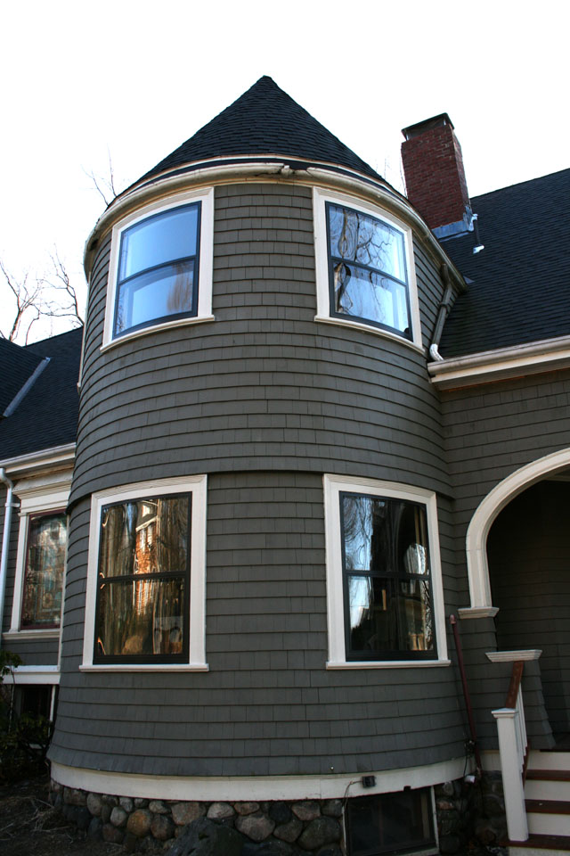 This dramatic Victorian home, as sen in the photo above, presented a wide range of window types requiring restoration, including a large number of curved sash. All operable windows received Cleary and Son's mechanical restoration. The curved windows, however, required a full in shop window restoration. We also performed restoration of many of the exterior window casings and sills, removing the storms where necessary.